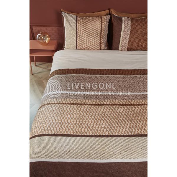 Dekbedovertrek Benthe bestaat uit verschillende banen met diverse weefstructuren en grafische motieven. Donkere en lichtere tinten wisselen elkaar af en zorgen voor contrast. Hier en daar worden de banen onderbroken door een moderne strakke horizontale streep. Dit dessin is beschikbaar in meerdere kleuren.
